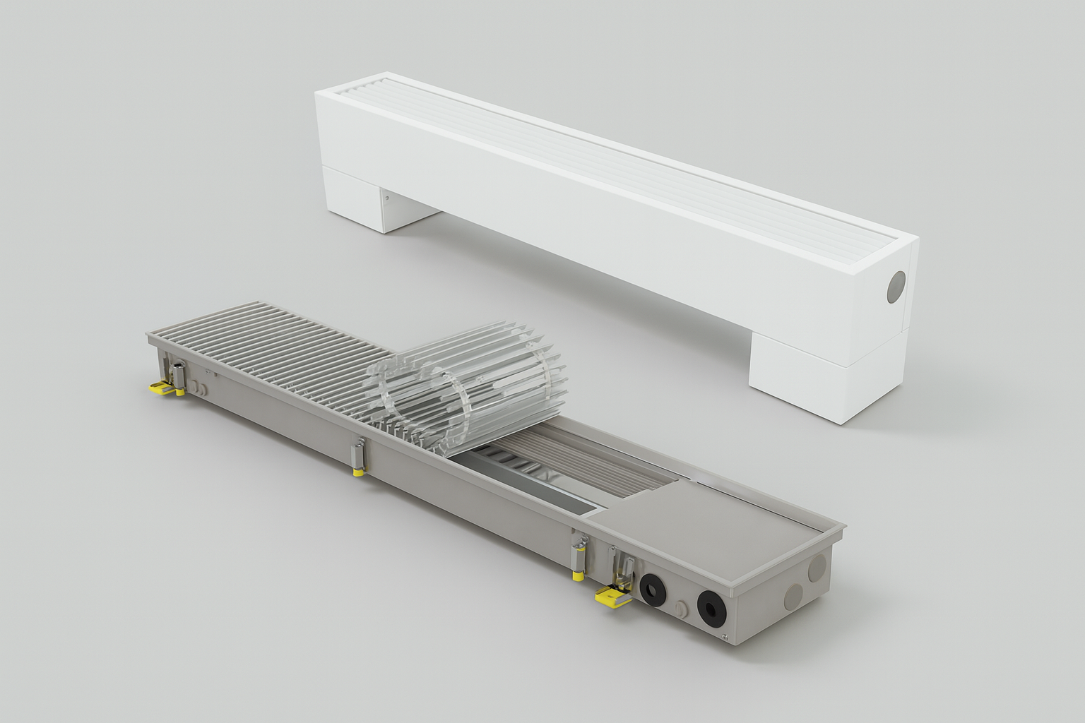 Konvektoriai su ventiliatoriais (dar vadinami aktyviais konvektoriais) yra idealūs sprendimai didelėms erdvėms, nes jie sukuria papildomą oro srautą, kuris padeda šilumai tolygiai pasklisti po visą patalpą. Tai ypač naudinga aukštų lubų patalpose, kur natūralus oro judėjimas yra ribotas. Ventiliatorius aktyvuoja šilumą, kad ji pasiektų net aukščiausias kambario dalis, užtikrinant komfortą tiek prie grindų, tiek aukštai lubų zonoje.